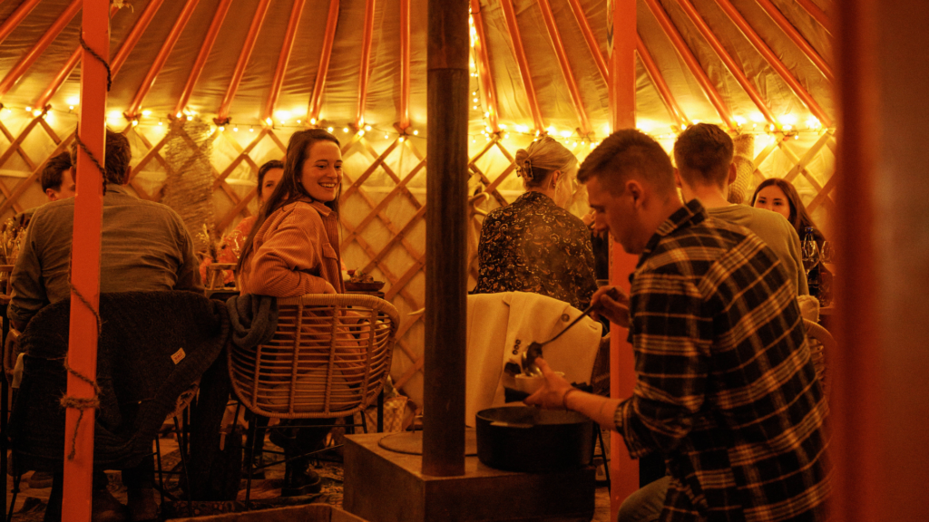 Te midden van een stukje landelijke pracht kom je terecht in 4 authentieke yurts die uitnodigen tot deconnecteren en gezellig tafelen. Een idyllische setting die perfect aansluit op het culinaire idee van ‘open fire cooking’.